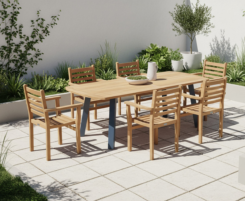 Alongside the contemporary Disk Table are 6 stylish Sussex stacking armchairs. Offering a smart space-saving solution, the chair stacks neatly for easy storage when not in use—ideal for flexible outdoor living. Expertly crafted from sustainably sourced grade-A teak, it features strong, traditional mortise and tenon joints for lasting durability. The gently cupped seat provides exceptional comfort, while the finely sanded finish ensures a smooth, refined feel.