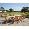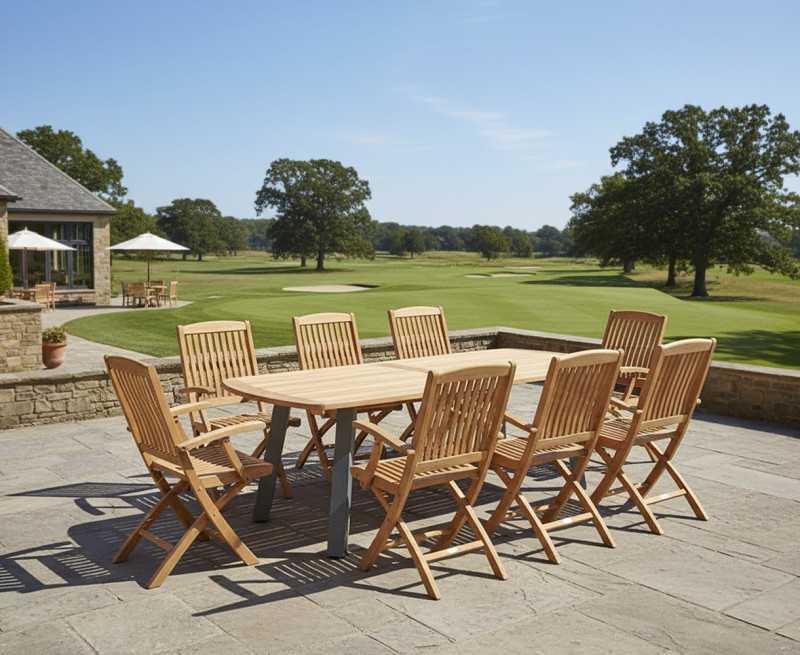 This elegant metal and teak outdoor dining set includes eight Bali folding armchairs, designed with both style and convenience in mind. These chairs are foldable, making storage a breeze when not in use so you can maximise your outdoor space.
