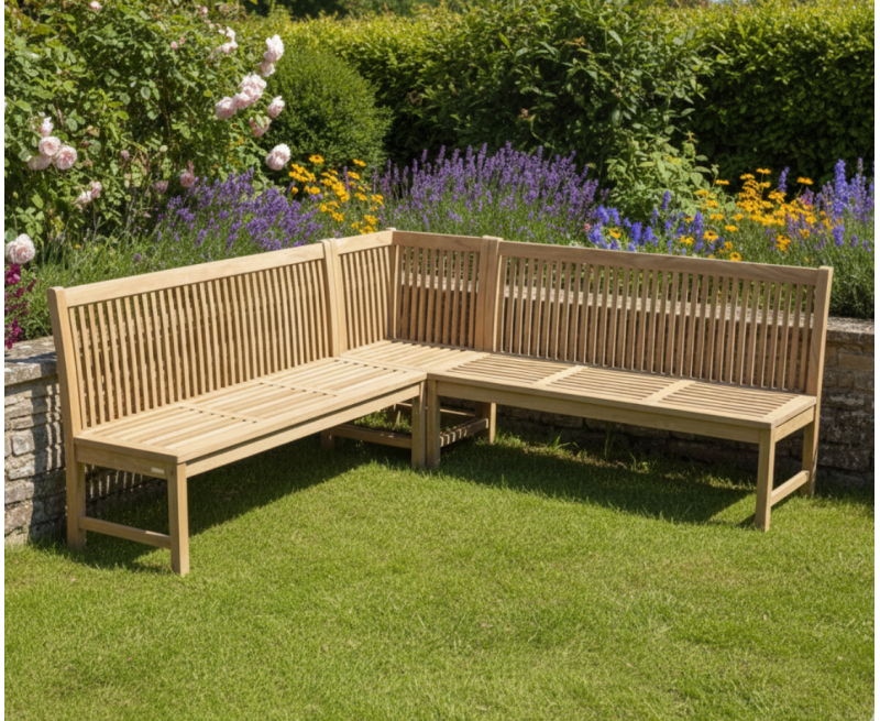 Expertly crafted from sustainably sourced grade-A teak, each piece showcases exceptional craftsmanship with classic mortise-and-tenon joinery for lasting strength and durability. The benches feature finely sanded, gently cupped seats for enhanced comfort, while the Reigate Corner Chair is defined by its softly curved, slatted backrests that meet at a precise angle, creating a snug and supportive corner seat.