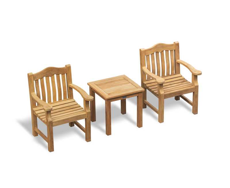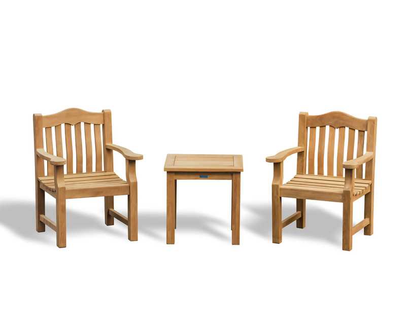 Bring timeless style and everyday comfort to your outdoor setting with this elegant garden furniture set, featuring the Winchester Square 0.6m Teak Tea Table and two Austen Garden Armchairs.